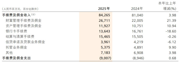 在手续费及佣金收入中,财富管理手续费及佣金收入267.11亿元,同比增长21.39%;资产管理手续费及佣金收入119.27亿元,同比增长10.94%;托管业务佣金收入53.75亿元,同比增长9.90%。