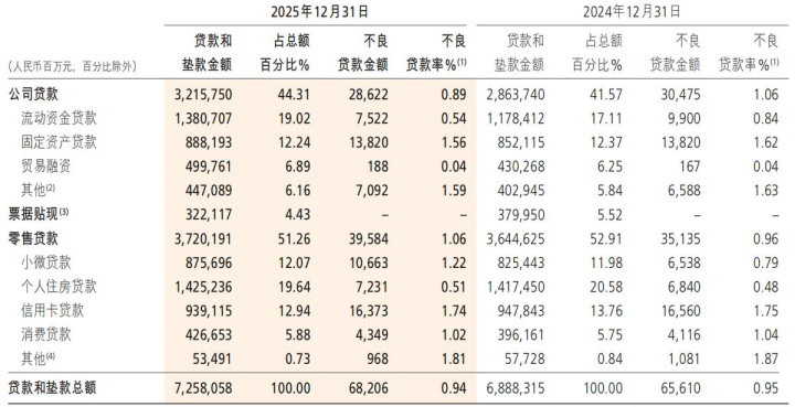 从不良贷款结构来看,公司贷款不良率为0.89%,较上年末下降0.17个百分点;零售贷款的不良率为1.06%,较上年末增长0.1个百分点。在零售贷款中,小微贷款和个人住房贷款的不良率较上年末有所上升,分别较上年末增加0.43个百分点、0.03个百分点。