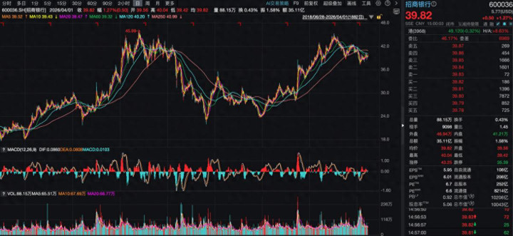 截至4月1日收盘,招商银行报收于39.82元/股,当日收涨1.27%,PE为6.7倍,PB为0.92倍,市值为1.02万亿。